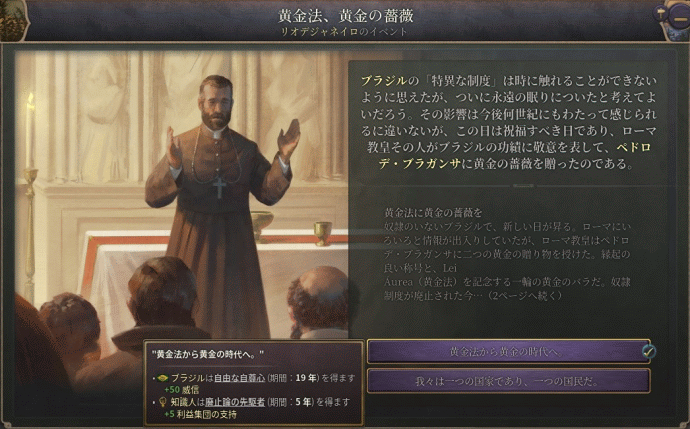 内戦中に奴隷制禁止を制定完了し、終戦とともに黄金法イベント。