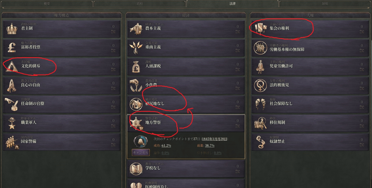 初手の法律は遺産奴隷制の検討。地主はこれに反対しないので、時間をかければ制定可能。