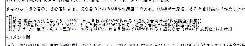 AARを作ったりwikiを編集する分には、比較的易しいテキスト整形のルールを軽く眺めて使えそうなものだけメモっておくくらいで十分である。