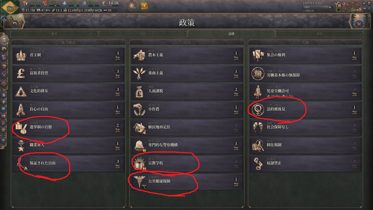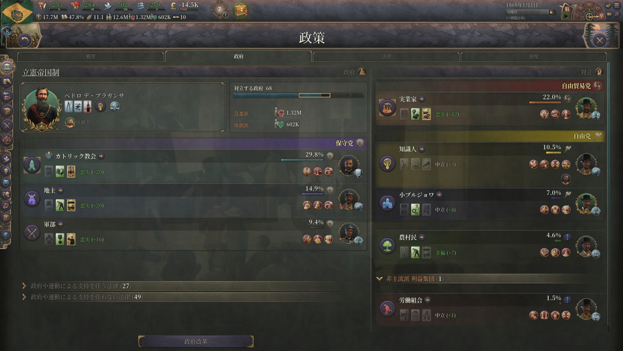 保証された自由:中盤以降体制派を増やし、体制派由来の利益団体バフを得るプレイが好きです。