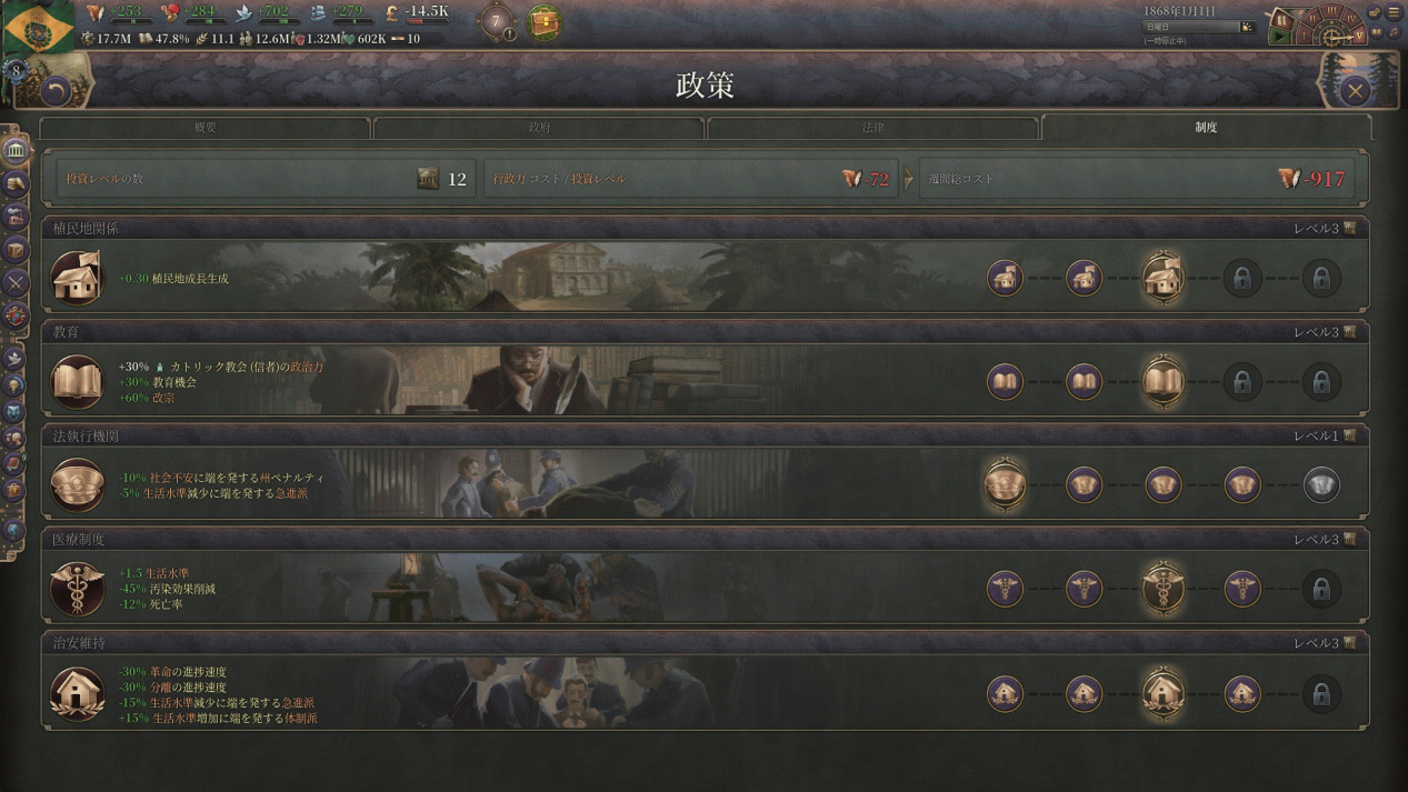 投資と割り切って行政府を建てて、学校・医療・植民を中心に伸ばしていきます。