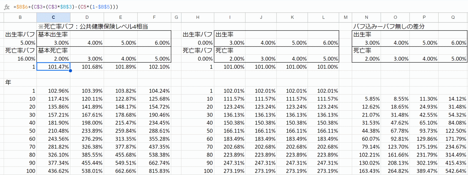出生率や死亡率バフの効果をざっくり計算した表が以下の通り。