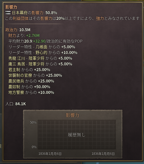 | 侍(軍部) | 10.1% | 水野忠邦 | 伝統主義者 | arrogant | イデオロギー「幕府」を持つ。ジャーナル「侍の落日」達成後「軍部」に名称変更。 |