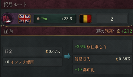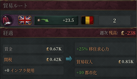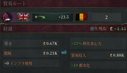 開始時のベルギー(重商主義/イギリスと貿易協定有)で、貿易ルートが高級衣服の輸入のみの状態で検証。