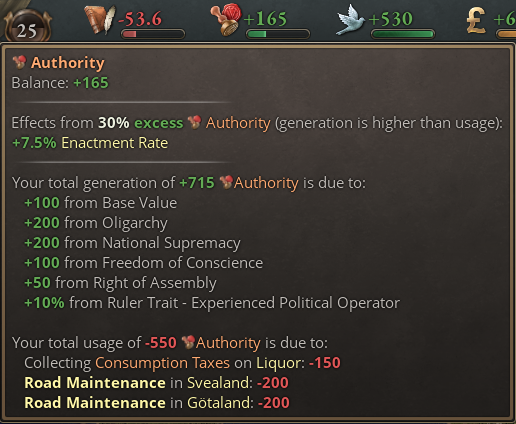 法律の効果は主に、自国に関する一部のパラメータを補正することだ。例えばPOPの死亡率を下げたり、関税率を変更したり、官僚機構(Bureaucracy)の算出を増加させたりできる。基本的に保守的で権威主義的な法律の方がより多くの権限(Authority)を常にもたらす。