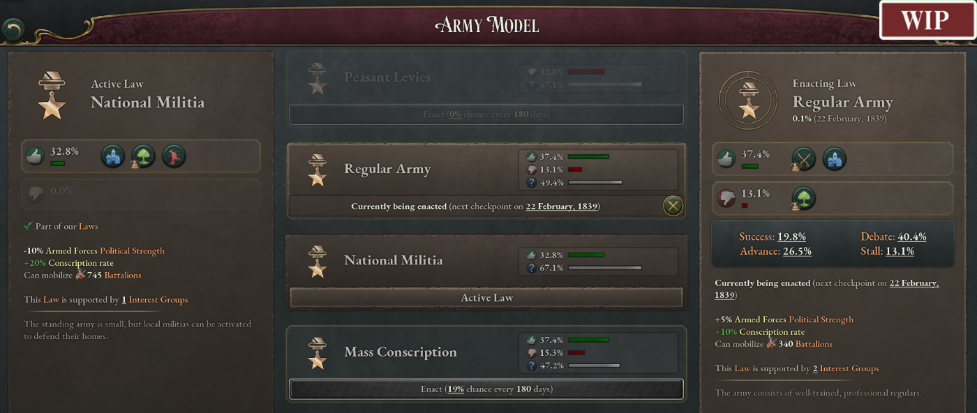 陸軍の体制*3(Army Model):陸軍を構成する人や組織のあり方を規定する。具体的には、徴兵されるPOPの職業、平時から常備軍をどれだけもてるか、軍隊の維持費はどれくらいかなどに関わっている。