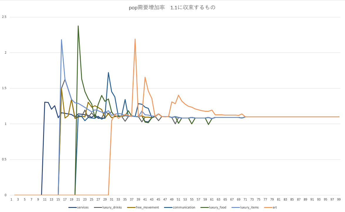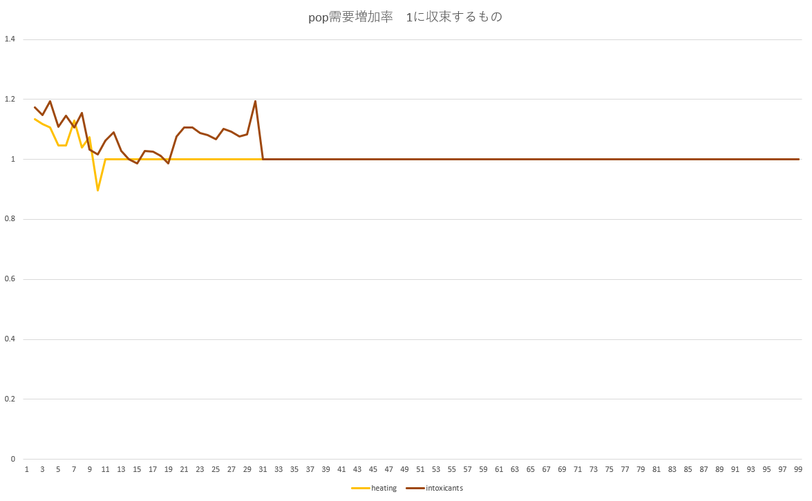 1.1の増加率のグラフを見ると分かるが、この二種は他の1.1に収束する商品と比べて1.1に収束するのが遅い。
